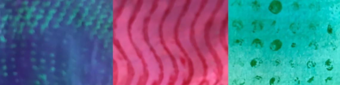 These are some examples of my hand-created patterns and textures, all with acrylic paint. All my marks are made from unique materials. For example, the center pattern was created with corrugated cardboard, and the pattern on the right was made with a dollar store toy, a base for plastic bricks.
